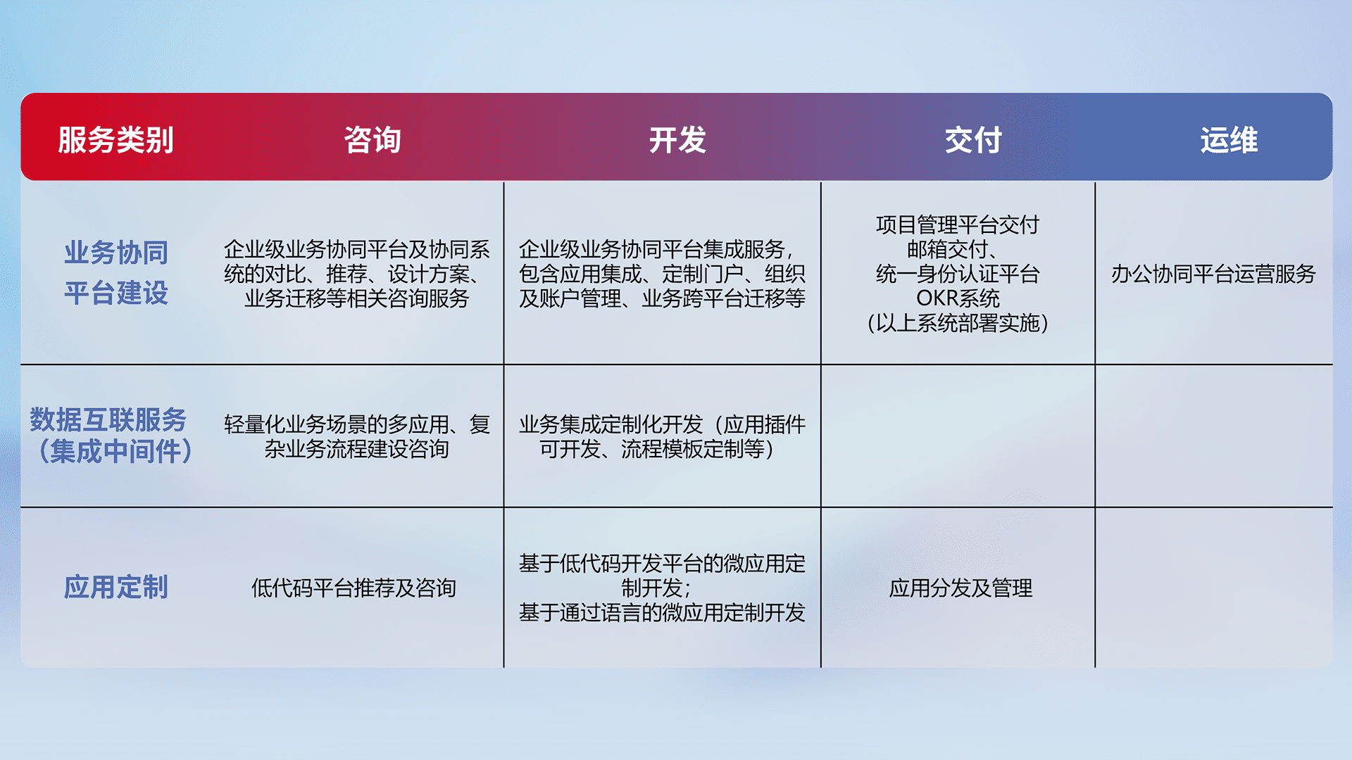 针对钉钉、、企微、、IDaas等平台级产品提供产品的规划、、、、方案、、交付、、、、定制化开发等服务,,实现如统一协同办公、、智能客户服务、、、混合会议管理、、智能数据查询、、、等业务场景,,,,实现数字化转型。。。